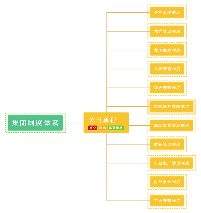 建立動態(tài)修訂機制,統(tǒng)籌做好公司治理制度的立改廢釋工作,確保公司規(guī)范運作有法可依、有章可循。將“黨組織建設、前置研究討論和決定企業(yè)重大事項”等有關黨建條款納入公司章程,進一步明確治理主體職責權限。建立以公司章程為基礎,“三重一大”決策制度、董事會授權管理制度為主干,各治理主體議事規(guī)則為支撐的公司治理制度體系。